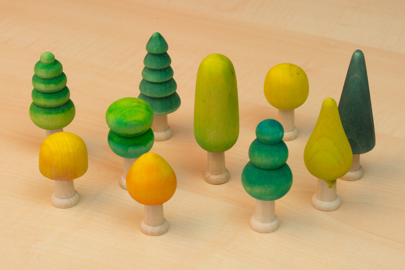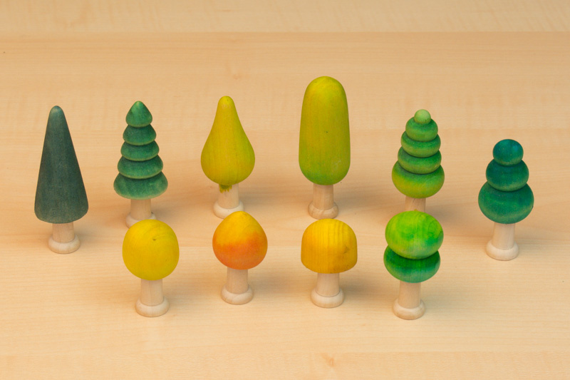 10 Bäume aus Holz in verschiedenen Formen - zwischen 7,5 und 4 Zentimeter groß. Perfekt für Eure kleinen Welten und das Spiel mit verschiedenen Tierfiguren.