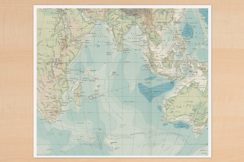 Legematerial zum Indischen Ozean. Als Kartegrundlage haben wir Kartenmaterial aus dem Standardatlas von 1905, dem "Harmsworth Atlas" verwendet - mit englischen Beschriftungen und sogar eingezeichneten Unterseekabeln, die zusätzliche Anlässe bieten können, über die Vernetzung der Welt und die Geschichte der Telekommunikation zu sprechen. Das Material enthält: