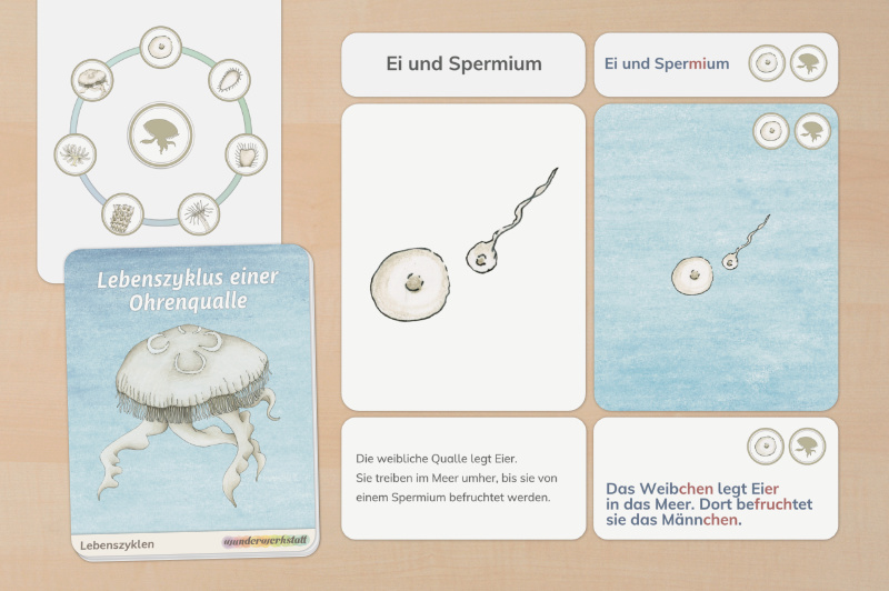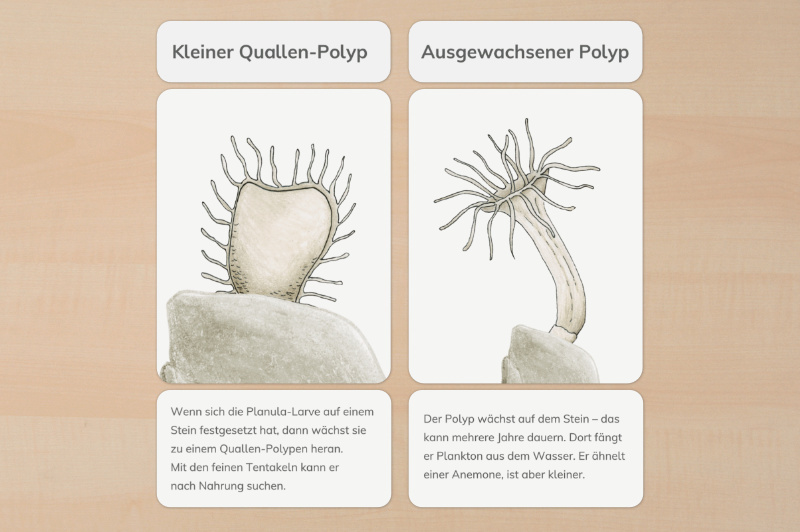 7 Stadien der Ohrenqualle mit kleinen Texten in Druckschrift.