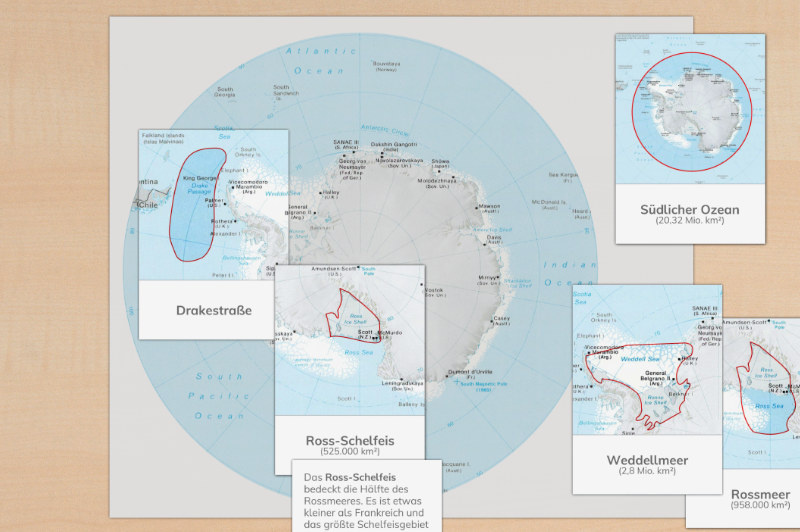 • Südlicher Ozean: 7 Kartenausschnitte mit markiertem Nebenmeer oder besonderem Ort, 7 Namenskärtchen und 7 Textkärtchen
