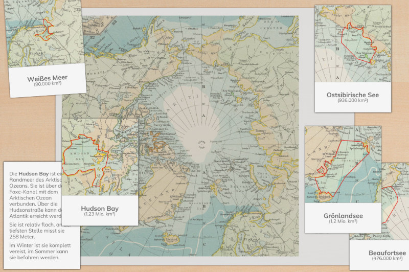 • Arktischer Ozean: 9 Kartenausschnitte mit markiertem Nebenmeer oder besonderem Ort, 9 Namenskärtchen und 9 Textkärtchen