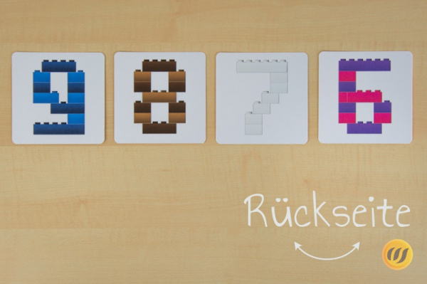 Die Ziffern von 0-9 aus DUPLO oder LEGO Steinen auf 89 x 89 mm großen Karten.