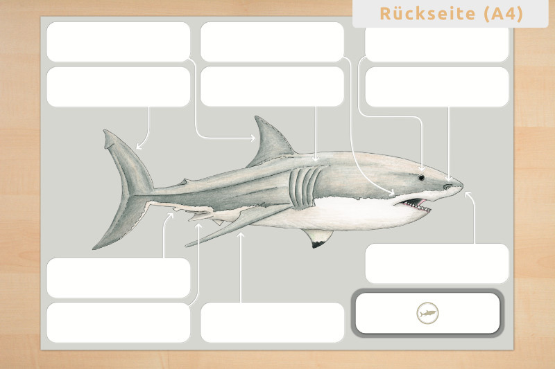 • Ein A4-Bogen mit leeren Feldern, auf die die Namenskärtchen passen. Vorderseite mit einem stilisierten Hai (Rückseite mit dem Weißen Hai).