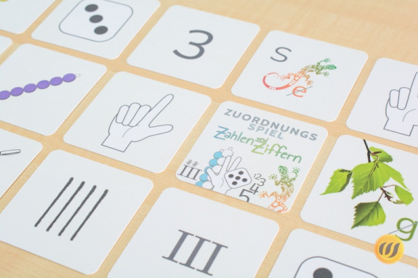 Dieses Spiel kann als Memory oder Zuordnungsspiel gespielt werden. Für jede Zahl gibt es 8 Kärtchen (also insgesamt 80 Karten!):