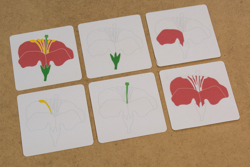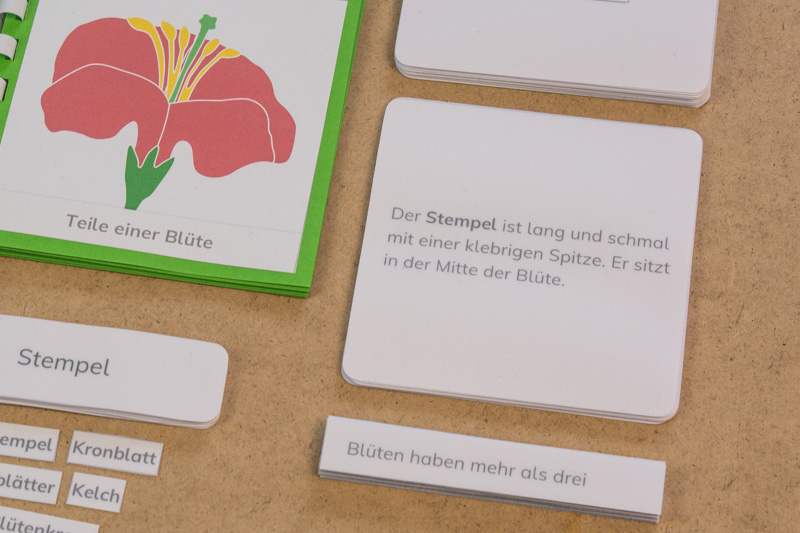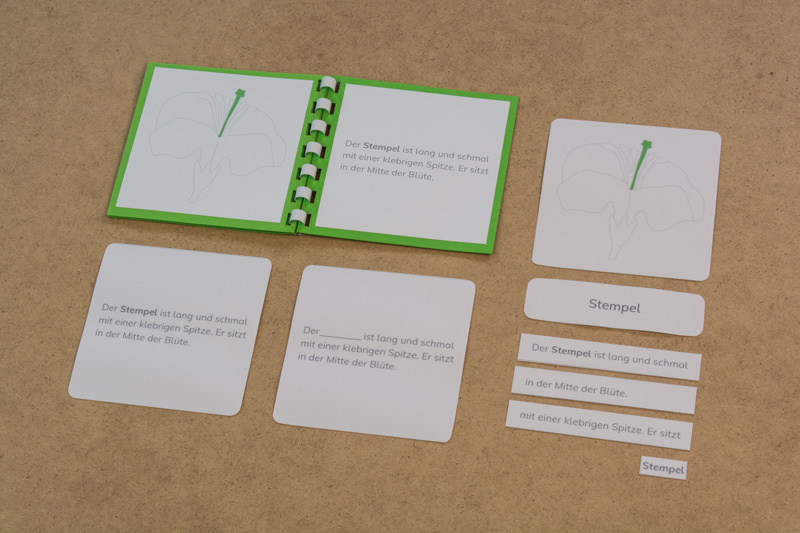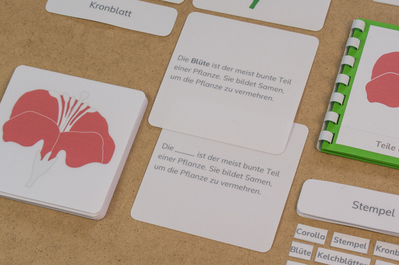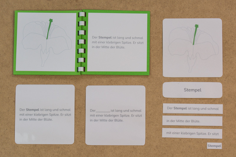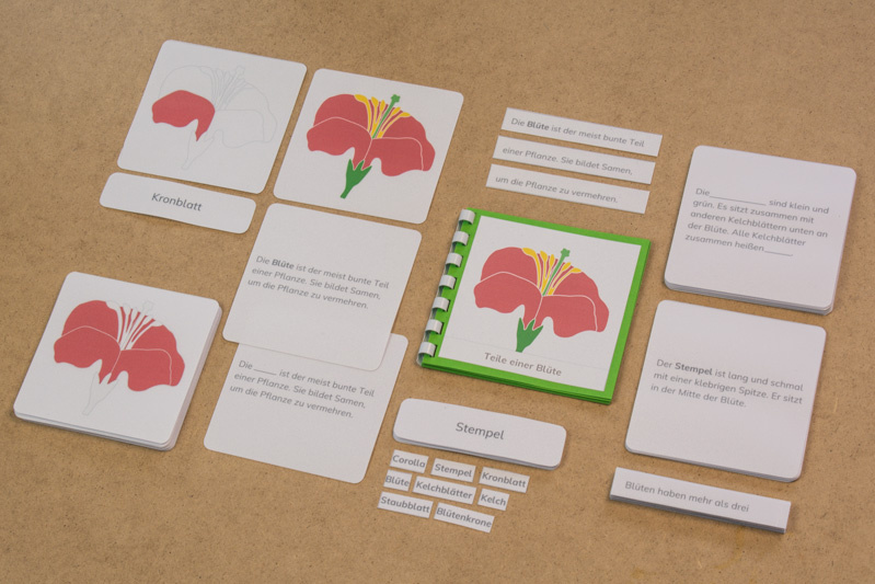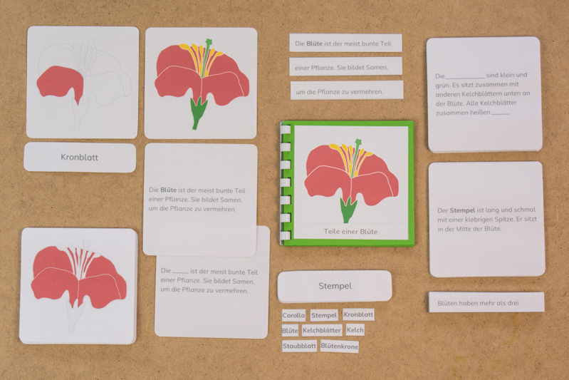 Das Material ist genau auf das botanische Puzzle des Montessori-Kinderhauses abgestimmt, die Sätze sind kurz und beschreiben die Elemente der Blüte.