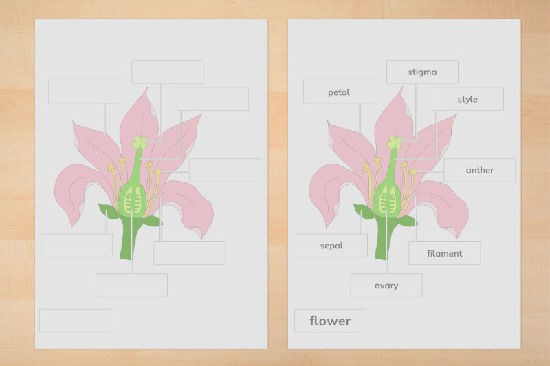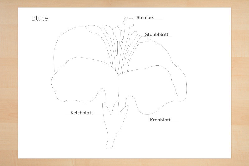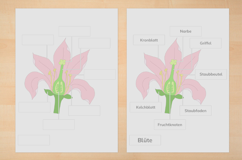 Außerdem eine Anatomie der Blüte mit einer farbigen Zeichnung mit mehr Elementen zum Selbstbeschriften mit Kontrollkarte.